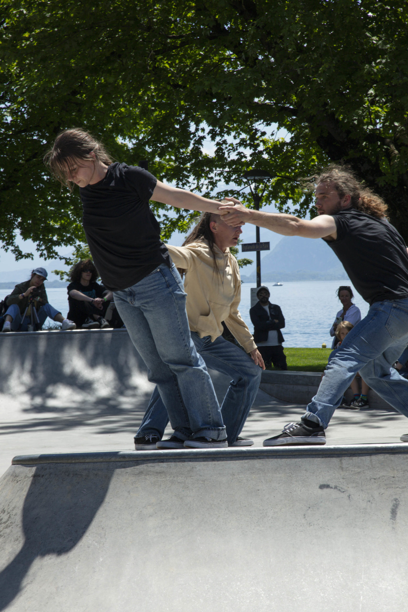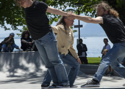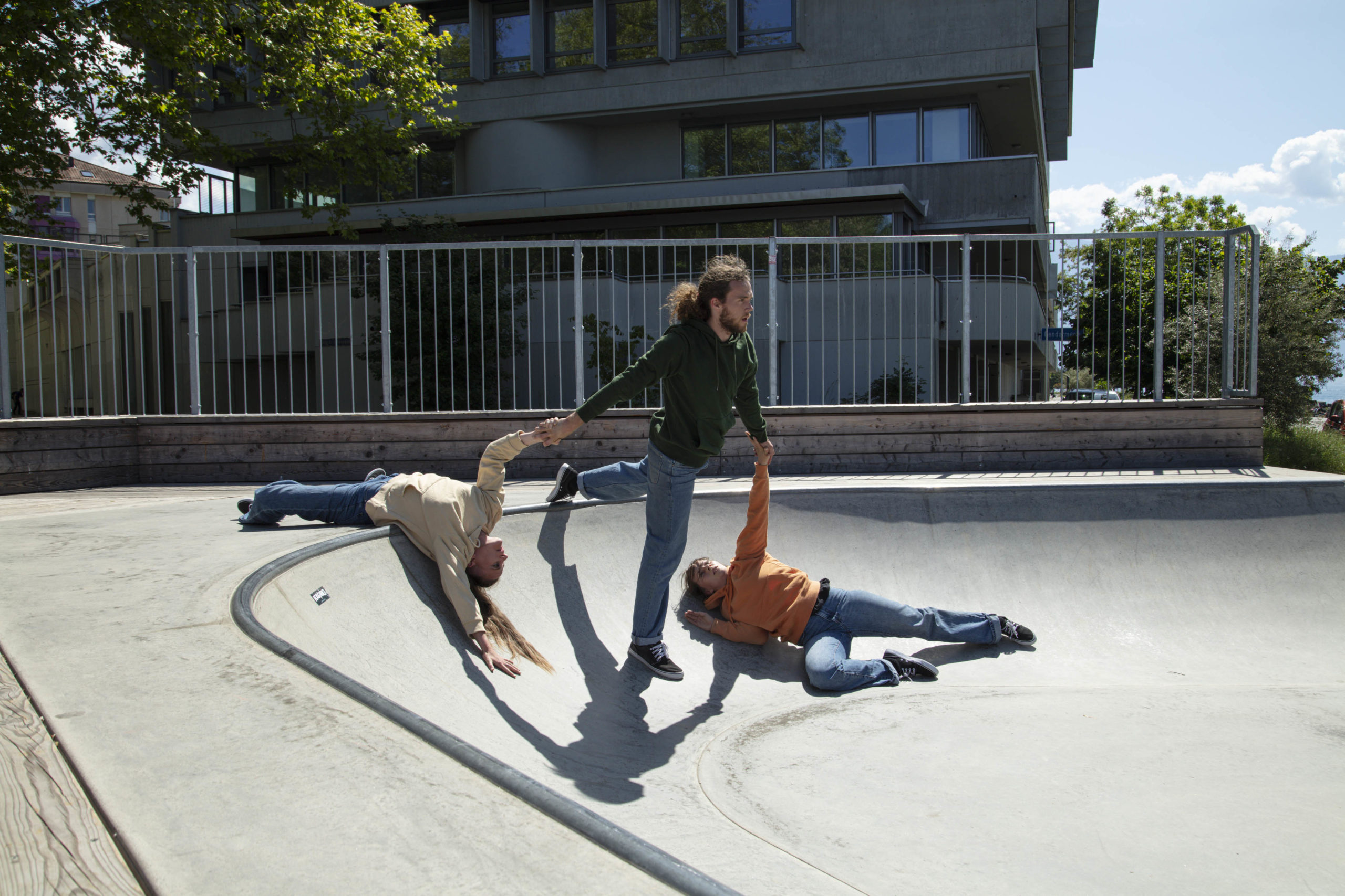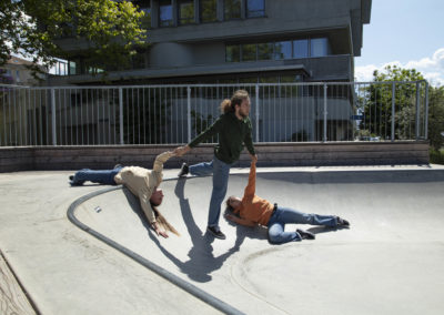 Décider de se défaire des contraintes en se les réappropriant à notre manière. Un défi lancé à la gravité, soulignant les appuis, les équilibres et déséquilibres des corps entre eux, en interaction avec un environnement des plus attractifs : une rampe de skateboard!
